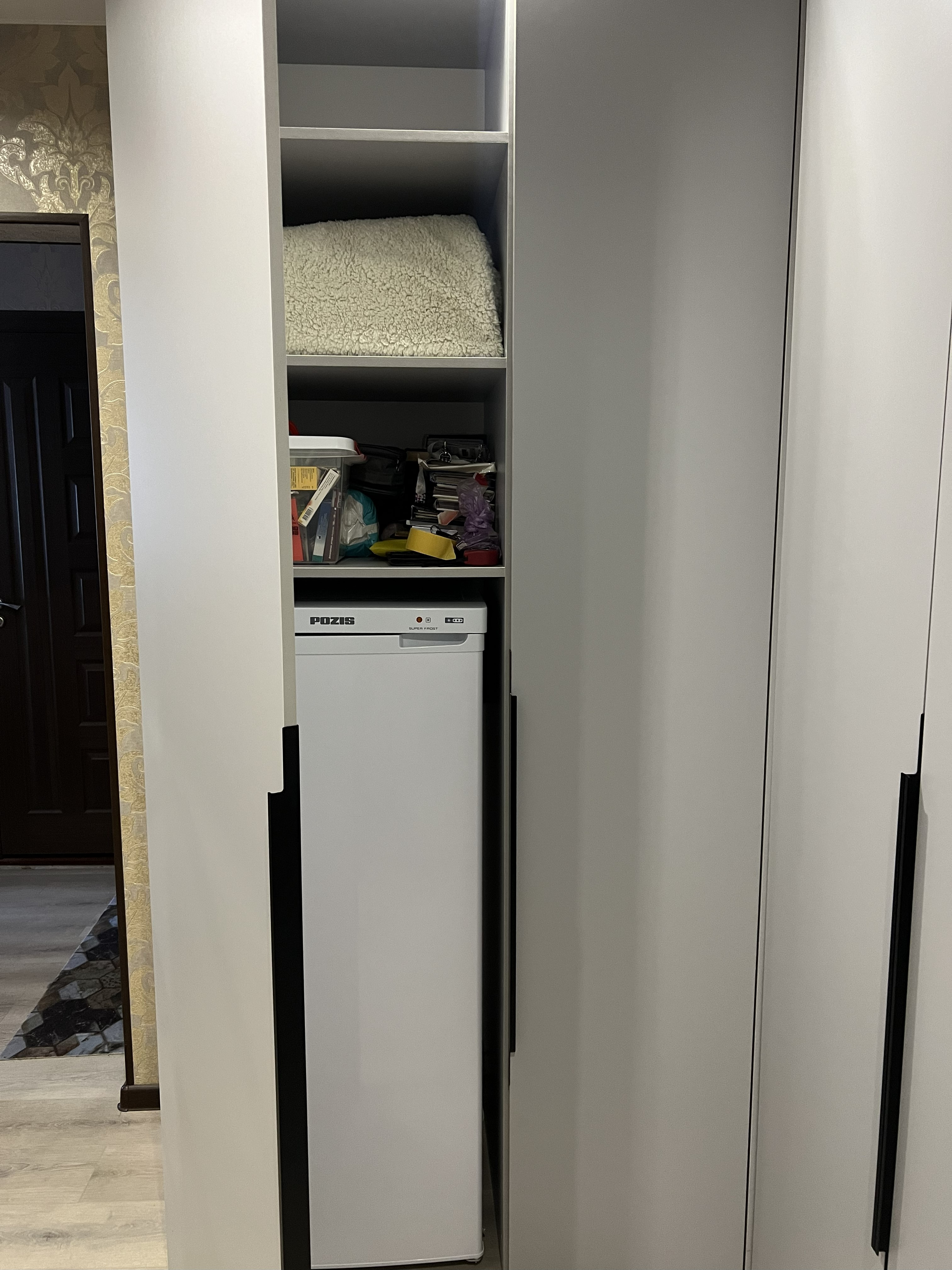 Угловой шкаф с накладными торцевыми ручками. Внутри спрятан холодильник.